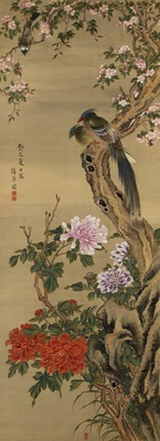岩陰に咲く艶麗な牡丹、屈曲して枝を伸ばす海棠に止まる白頭翁とつがいの綬帯鳥など、吉祥モチーフで華やかに画面を構成し、背景に淡墨を刷いて印象的に際立たせた典型的な南蘋風の作品である。牡丹と海棠の花弁や葉には裏彩色があり、濃淡で表情をつけている。綬帯鳥は表からの彩色のみで羽の先をぼかすように柔らかく描き、空気をはらんだふくらみを表現している。後草園は佐々木原善から南蘋派の画法を学んだとされているが、充実した作品は60歳を超えて隠居した後に多く見られ、本作もその一つである。