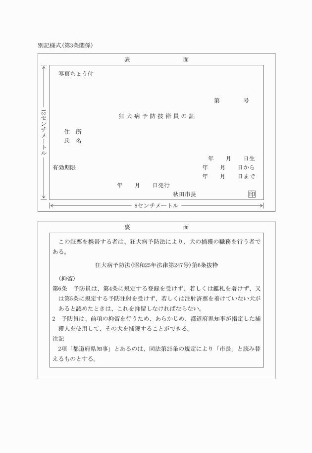 2 捕獲人が犬の捕獲に従事するときは、省令第14条の規定による証票のほか、身分証明書(別記様式)を携帯しなければならない。