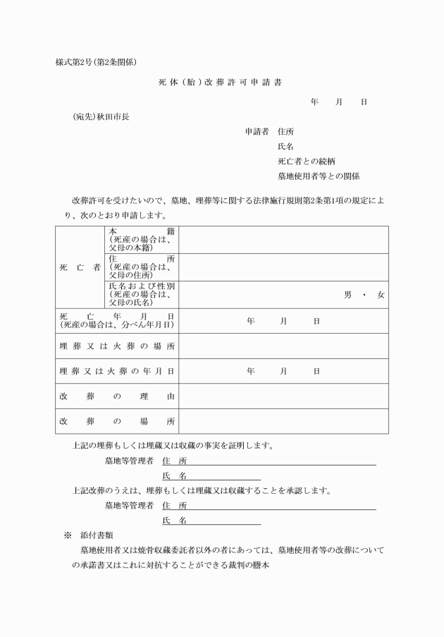 2 省令第2条の申請書は、死体(胎)改葬許可申請書(様式第2号)とする。