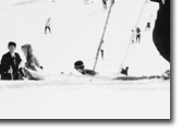 学生服、学生帽でさっそうと滑り降りる中学生。ここはどこのスキー場? これは手形の“水道山”の反対側にあった手形山スキー場です。 山頂付近は眺めがよく、ゆるやかなスロープがふもとまで続き、 大勢のスキーヤーで、斜面一面にクモの子を散らしたようなにぎわいだったといいます。 スキー道具や防寒具もままならなかった昭和20年代、学生服や背広で滑る人もいて 写真を見ているだけでなんだかこっちまで寒〜い感じがしてきます。 多いときで1日5,000人もの人出でにぎわった手形山スキー場。 昭和48年、仁別に太平山スキー場がオープンするまで、 家からもっとも近いスキー場として市民に親しまれていました。 |