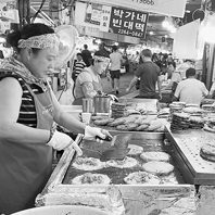 ![]() 初の韓国旅行はソウルの広蔵市場での腹ごしらえからスタート。目移りするお店がずらりと並ぶ中、分厚くて大きなチヂミのビジュアルと香りに惹(ひ)かれ屋台へ。そのおいしさに感動し、滞在中はおしゃれなカフェには行かず、ひたすら屋台で韓国グルメとビールを楽しみました<安> |