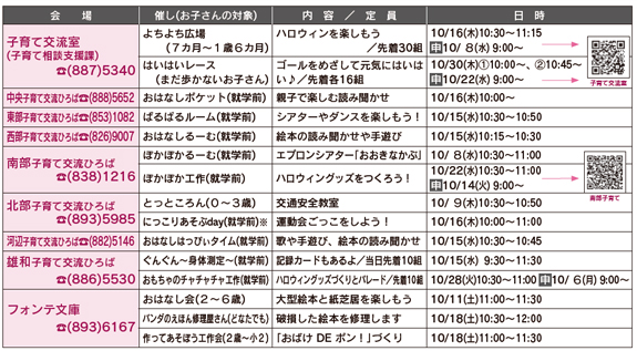 ◆会場が南部市民SC2階和室 対象/就学前のお子さんと保護者(保護者のみ、妊婦さんとそのご家族もどうぞ) 日時/10月15日(水)10:30〜11:20 先着/20組 申込み/10月7日(火)9:00から下記コードを読み込むか電話で南部子育て交流ひろばtel(838)1216 ![]() 南部子育て ◆会場が子育て交流室 対象/2カ月〜就学前のお子さんと保護者 日時/10月23日(木)10:30〜11:15 先着/12組 申込み/10月15日(水)9:00から下記コードを読み込んで 問い合わせ/子育て相談支援課tel(887)5340 ![]() 子育て交流室 |