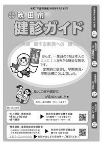 ![]() ●問い合わせ/保健予防課tel(883)1176 「健康だから大丈夫」と思っていませんか? 早期のがんはほとんど自覚症状がないため、自覚症状が出たときには、すでに進行していることもあります。検診によって発見されたがんは、早期の段階で治療すれば9割が完治すると言われています。 あなたとあなたの大切な人のために がんは早期発見で、治療方法を選ぶことができ、治療に要する期間や治療のための精神的・身体的負担だけでなく、経済的負担も軽くすることができます。大切な人のために検診を受けましょう。 「秋田市健診ガイド」をご覧ください ![]() 職場などで検診を受診する機会のないかたを対象に、各種検診を行っています。検診を実施している医療機関や料金などは、5月に全戸配布した「秋田市健診ガイド」(上のイラスト)をご覧ください。下記コードからもご覧になれます。 ![]() 秋田市健診ガイド |