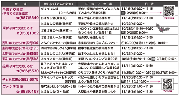 お子さんの対象/就学前 日時/10月28日(火)10:00〜11:00 会場/南部市民SC1階多目的ホール 申し込み/10月21日(火)9:00から下記コードを読み込むか電話で南部子育て交流ひろば tel(838)1216 ![]() 南部子育て |