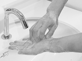 ◆正しい手洗い方法 <1>流水で両手を十分に濡らす <2>石けんを泡立て、手首から5センチ上まで、15〜30秒間もみ洗い <3>手のひらと甲をこすり洗い <4>汚れが付きやすい指先、爪は入念に、指の間、親指、手首も忘れずに <5>指先を上に向け、流水で洗い流す <6>洗った手は、乾いた清潔なタオルで拭く ![]() |