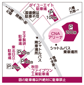 ◆駐車台数には限りがありますので、バス・タクシーの利用や自家用車の相乗りをお願いします ◆秋田駅と会場を往復(県庁・市役所前経由)するシャトルバスをご利用ください 図の駐車場以外絶対に駐車禁止 ![]() |