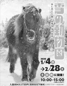 ![]() ![]() 会いに来てね♪ 動物たちが雪とたわむれ、走り回る姿など、普段は見ることができない冬の動物たちの様子を見てみよう! ★初日は、先着50人にフォトカードをプレゼント ★トナカイやポニーの園内散歩、カピバラの湯っこ、まんまタイム、エサやり体験、動物解説など盛りだくさん! ★週替わりの特別動物イベントを開催 ★ピクニック広場の長い斜面をソリで滑ろう!(積雪時のみ。ソリは各自でお持ちください) ★1月10・11・12日、2月21・22・23日はアニパの暖房付き観覧車に乗れるよ(1人400円。天候により中止の場合あり) *ビジターセンターの売店・食堂は営業しますが、アニパと園内の食堂はお休みです。また、アソヴェの森の遊具も使用できません。 ●問い合わせ/大森山動物園tel(828)5508 |