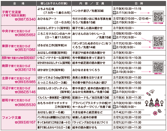 日時/2月25日(水)10:30〜11:20 会場/南部市民SC2階和室 先着/15組 申し込み/2月18日(水)9:00から下記コードを読み込んで 問い合わせ/南部子育て交流ひろばtel(838)1216 ![]() 南部子育て |