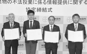 市と一般社団法人秋田県産業資源循環協会、一般社団法人秋田サスティナ協会、公益財団法人秋田市総合振興公社が、「廃棄物の不法投棄に係る情報提供に関する協定」を締結しました。