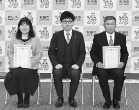 ●問い合わせ/環境都市推進課tel(888)5709 受賞者 伊藤修さん(有限会社協伸産業) 塚田春美さん(秋田協同清掃株式会社) 環境にやさしいあきたをめざして ![]() 2月4日の表彰式 |