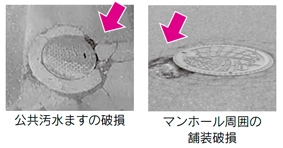 マンホール周辺の段差や陥没、道路境界付近に設置されている公共汚水ますの破損など、下の写真のような異状を見つけた場合は、次の2点を下水道整備課へご連絡ください。tel(864)1455
