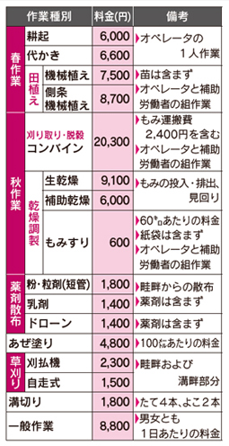 下表の料金は、一般的な10アール区画のほ場条件をもとに算定した標準額を示したものです。あくまでも目安ですので、実際の料金設定は地域の実情などを考慮し、当事者間の話し合いで決めてください。