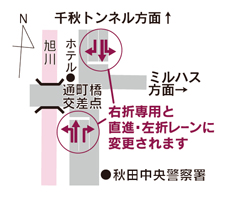 通町橋交差点に南側・北側から進入する際の信号表示と走行車線が、3月16日(月)から変わります(予備日は翌週月曜)。路面標示の矢印の位置が下図のようになりますので、進入の際は十分にご注意ください。なお、これらに伴う工事による交通規制を行いますのでご協力をお願いします。 問い合わせ/県警察本部交通規制課tel(863)1111 ![]() ◆令和8年度防衛省採用試験 種目ごとに、受験資格、申込期間、試験日(4〜11月に順次実施)が異なります。詳しくはお問い合わせください。募集種目/予備自衛官補(一般・技能)、一般曹候補生、自衛隊幹部候補生(一般)、自衛隊幹部候補曹、自衛隊幹部候補生(歯科・薬剤科)、医師・歯科幹部 問い合わせ/自衛隊秋田募集案内所tel(834)5000 ◆秋田の史跡を学ぶ会 郷土の歴史文化講座と年2回の県内史跡巡り。日時/4月8日(水)から12月9日(水)までの原則毎月第2・4水曜、10:00〜12:00 会場/東部市民SCほか 年会費/5,000円 申し込み/同会の原田さんtel090-4029-8668 |