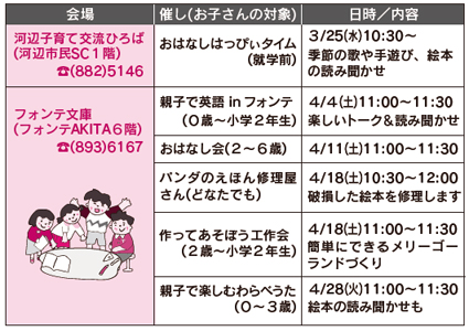 対象/3歳〜小学生と保護者 日時/4月4日(土)14:00〜14:40 会場/きららとしょかん新屋図書館 問い合わせ/tel(828)4215 |