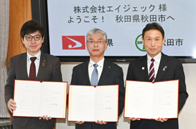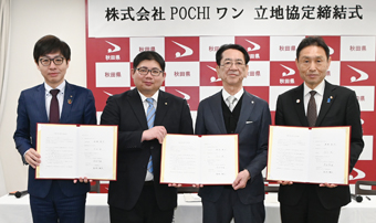 | ●問い合わせ/企業立地雇用課tel(888)5733 株式会社エイジェック(本社:東京都) 事業内容/BPO(業務プロセスを外部専門業者が請け負い、企業をサポートする事業) 操業時期/令和8年4月 将来の雇用予定/100人 ![]() 写真中央が同社の並木英雄執行役員(3月9日の立地協定締結式) 株式会社POCHIワン(親会社:千葉県) 事業内容/ペットフード製造 操業時期/令和8年11月 将来の雇用予定/27人 ![]() 写真中央右が親会社である日本一ホールディングス(株)の染谷幸雄代表取締役会長、左が(株)POCHIワンの佐々木航太代表取締役社長(3月11日の立地協定締結式) |