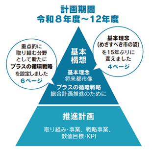 この計画に基づき、今後、市民のみなさんと「共感と共創」によるまちづくりを進めていくこととなります。総合計画のほか、概要をまとめたガイドブックを市ホームページで公開していますので、ぜひご覧ください。 広報ID番号1047065 ●問い合わせ/企画政策課tel(888)5462 ![]() *KPI=重要業績評価指標の略 |