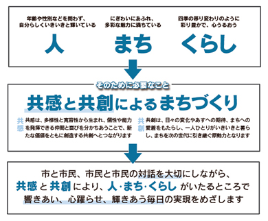 −総合計画の特徴その2−めざすべき市の姿である「基本理念」を新しくしました<基本理念>響きあう心躍る人・まち・くらし〜共感と共創で輝く秋田市へ〜 |