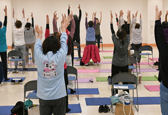 ![]() 3月2日、寒さで縮こまった体をほぐす「運動講習会」をイオンモール秋田で開催。講師の動きに合わせて、いすやヨガマットを使ってゆっくり、じっくりと体をほぐし、春に向けて歩くための体をみんなで整えました |